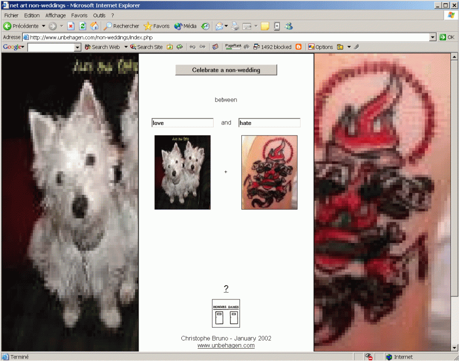 « (…) Another net based project in search of our relationship towards images as a cultural code, more humourous, yet at the same time deeply philosophical, is Christophe Bruno’s Non-weddings which makes use of the ubiquitous Google-apparatus as a search-engine. It employs this tool for a net-based dyptich that is based on the supposed dualism of two keywords that serve as a search tool. The play is, as the author states, on the linguistic set of signifier and signified, on a secondary level on the reading of this set by Jacques Lacan, and on a third level on the friction between language and a mere trace of an image that is only in some arbitrary way related to the search word. Deconstruction, here, is coined “non-wedding”, i.e. the matching of things that do not belong together. The friction is the infinite source of “jouissance”, as the French theorist says. We rejoice in the multiple shifts of meaning that occur between a preconceived notion of a term/image relation and the non-wedded results. We begin to wonder how a term can possibly be related to an image at all. »