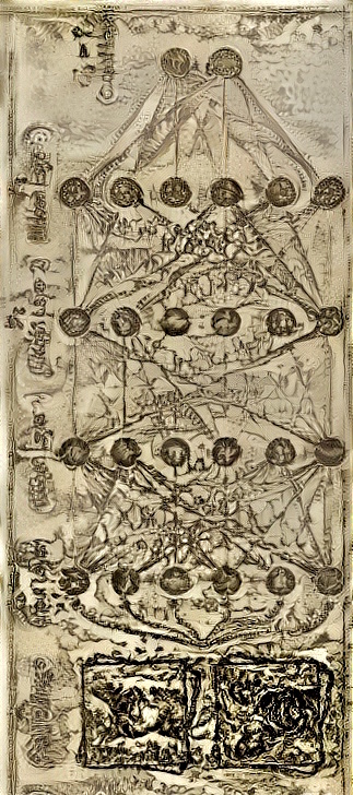 Ces dessins générés par IA et imprimés sur papier texturé Fine Art sont des hybridations entre des gravures de l’antique « Grande Chaîne de l’Être » et diverses représentations graphiques de réseaux de neurones profonds (Deep Learning). Le titre de la série, « L’univers autodidacte », est tiré d’un article récent de Lee Smolin & al. suggérant « une approche de la cosmologie dans laquelle l’Univers apprend ses propres lois de la physique », une approche que l’art, libéré des normes, s’approprie.