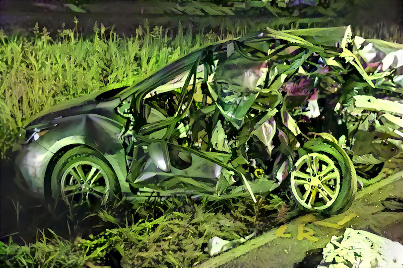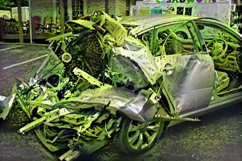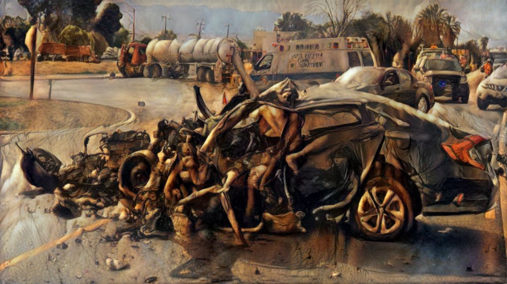 L’artiste a « entraîné à peindre » une Intelligence Artificielle qui était destinée à conduire une voiture autonome Uber. La machine, perturbée dans son processus de Deep Learning, a produit l’image d’une scène de rue avec une compression à la César (1960), et elle a également choisi de « s’inspirer » du style néoclassique de L’Enlèvement des Sabines de Jacques-Louis David (1799), dont elle avait été nourrie lors de son « désapprentissage », parmi des milliers d’autres oeuvres. Mêlant tragiquement l’acier avec les formes organiques, la machine n’a visiblement pas respecté le code de la route ! Au-delà de la critique de l’académisme et de la standardisation propres à notre époque machinique, l’oeuvre souligne l’ubérisation généralisée des formes sociales, urbaines et esthétiques contemporaines, avec, peut-être par le plus grand des hasards, un clin d’oeil au symbole que représente la création mythique de la ville de Rome (que l’IA a semble-t-il associé au prénom de César Baldaccini !).