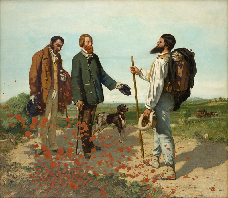 L’IA a visiblement pris les trois petits coquelicots du tableau de Gustave Courbet (au premier plan, en bas à gauche) pour des anomalies picturales, et a confondu ces taches de couleur « pré-impressionnistes » avec Les Coquelicots de Claude Monet. La machine a ainsi mêlé deux moments de la modernité artistique qui ébranlèrent les lisses certitudes des peintres académiques, et officiels, d’alors.