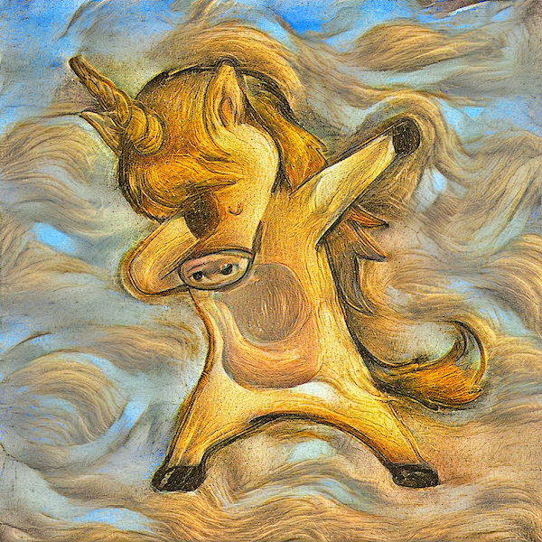La « Vénus sortie des eaux » ou « Vénus anadyomène » (du grec ancien ἀναδυομένη, « surgie vers le haut ») est un thème artistique courant de la peinture occidentale, issu de la mythologie gréco-romaine. Une IA, spécialisée à la fois en histoire de l’art et en langages anciens, a traduit « anadyomène » par « bottom-up » et a mêlé La Naissance de Vénus de Botticelli avec un mème anonyme, la « Dabbing Unicorn », forme qui a émergé de l’Internet en mode « bottom-up », et a été massivement partagée, disséminée et détournée.