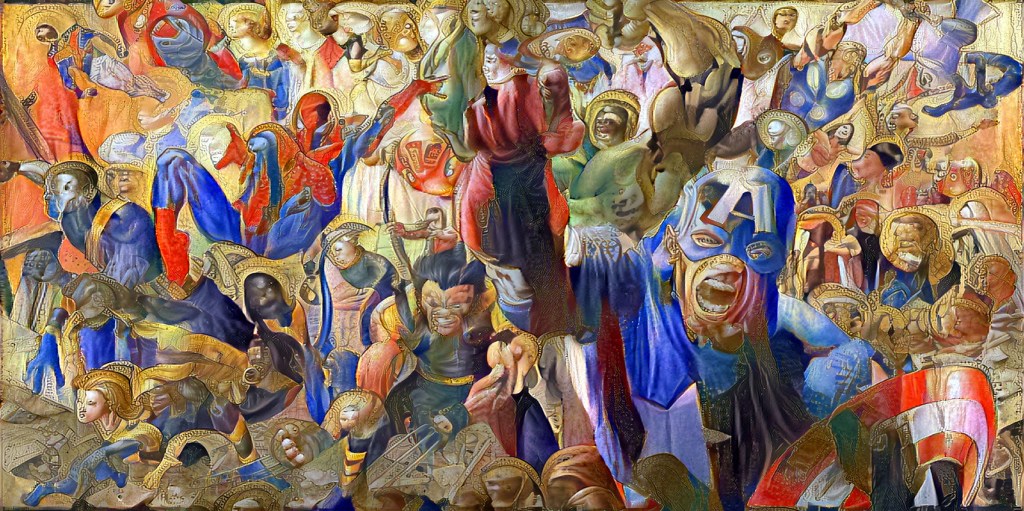 A transfiguration of a panel by Fra Angelico (Altarpiece of San Domenico di Fiesole), by Marvel’s new hagiographic heroes.