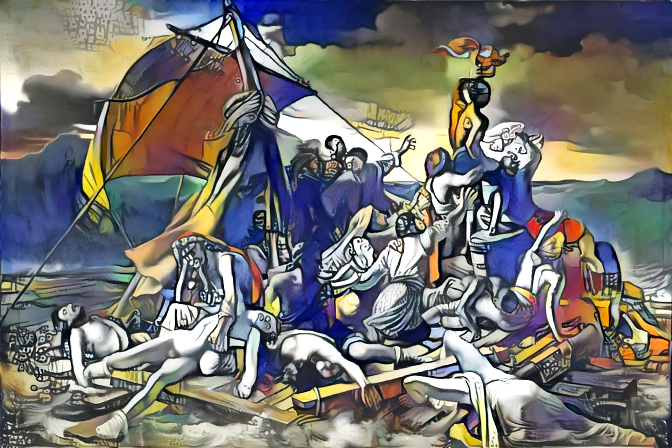 The neural network massively fed with art history, used by the artist, produced here a friction between two artworks made by painters who have distanced themselves from the history of academic art: The Raft of the Medusa by Théodore Géricault (1819), and Leisure, by Fernand Léger (1949). One scandal calls for another: the viewer watching The Raft of the Medusa today tends to associate the image with the contemporary scandal of migrants flocking to Western cities. Leisure is, for its part, a tribute to paid vacation and to an urban proletariat seeking to free itself from the labour value. The friction produced appears aesthetically successful while containing an interpretation that disturbs morals as evidenced by the title of the work, The Development of Mass Tourism.