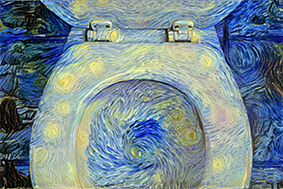 An irresistible play on words (“Gogue” means “toilets” in French slang), an equally irresistible nod to the contrepèteries of Duchamp and his Fountain. Van Gogue is shattered in the nights of social and artistic discredit, carried away by the ceaseless flows of low materialism and black holes.