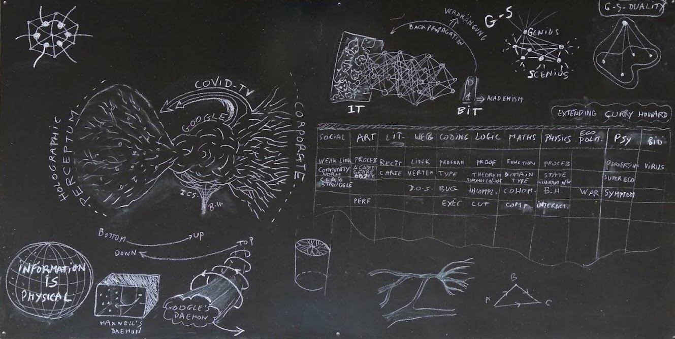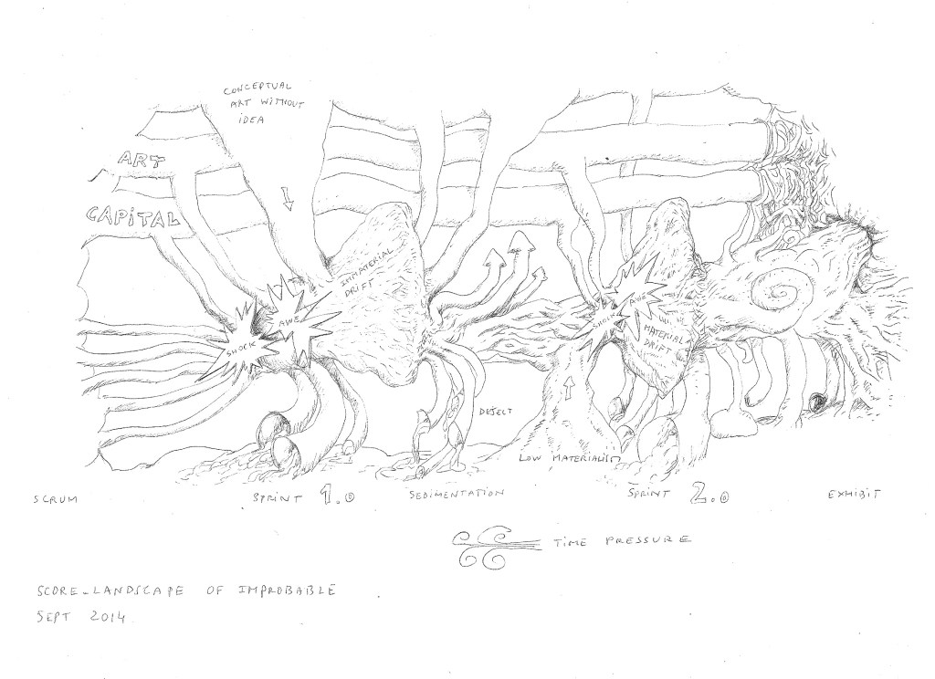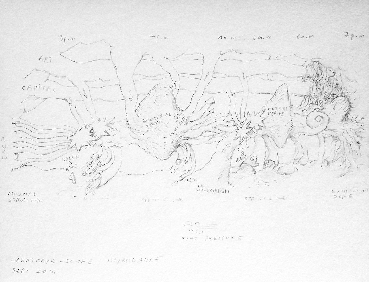 My approach is immersive and in situ. For several years I have been working on the post-Fordist production processes of cultural capitalism. These processes, inherited from both Toyotism and hacker practices, are documented and illustrated in the literature (agile methods, scrum, kanban, sprints, are examples of terminology). I embed in startups, observing interactions between clients, marketers, designers, developers… Every aspect of project management, from challenges to missteps, is captured. Similarly, I study artistic workshops and their production flows. Over time, I map these observations, drawing from influences such as economic models, entrepreneurial strategies, neuroscience, scale-free network theories, or elements of theoretical physics. These charts may also be called “data drawings without data”.
